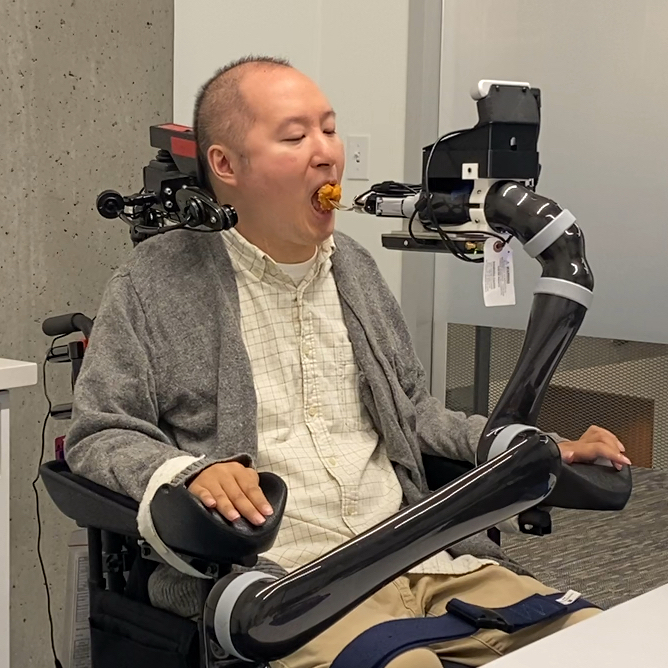 ADA is a wheelchair-attached robot arm that enables people with motor impairments to independently feed themselves. I worked closely with over a dozen end-users to identify their needs and priorities, learn robot-executable food acquisition actions, and develop and evaluate the end-to-end system. The system has fed end-users diverse meals of their choice—grilled salmon, pizza, salads—in diverse out-of-lab environments—a cafeteria, conference room, and office. I also led a 5-day deployment of the system in an end-user's home, where it fed him 10 meals across varied spatial, social, and activity contexts.